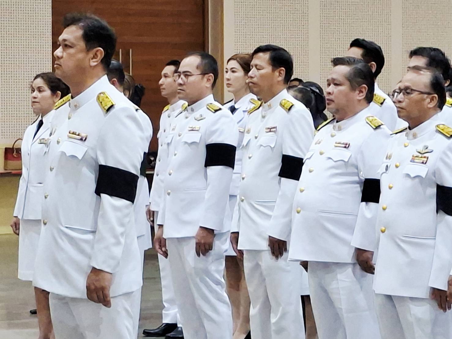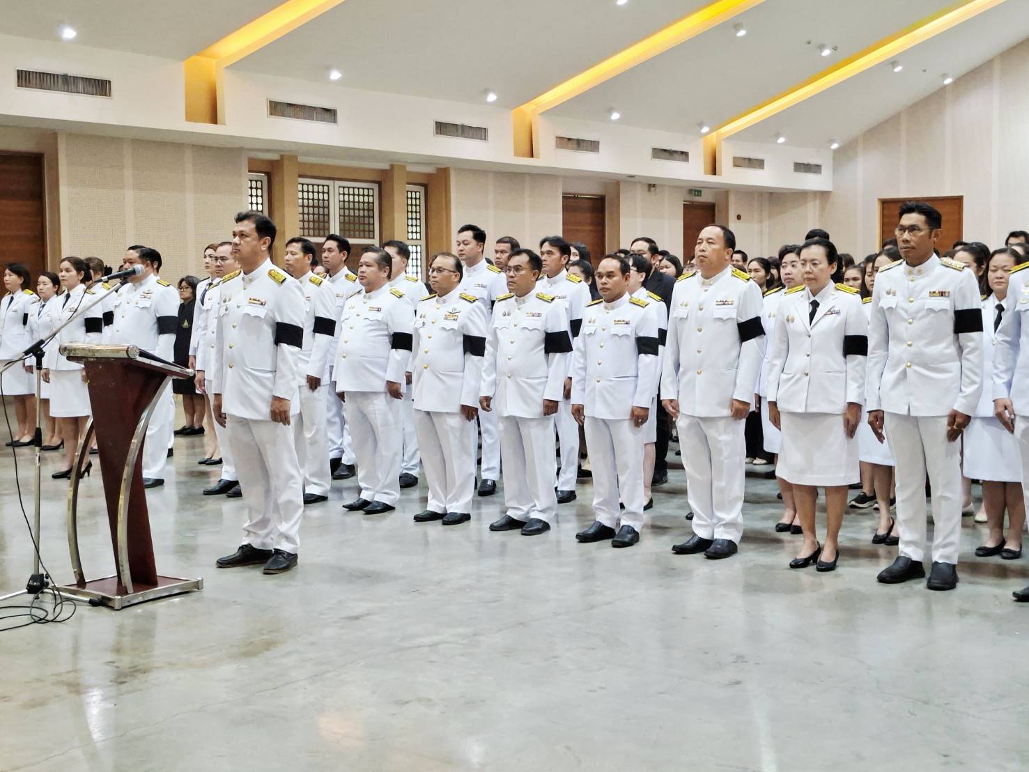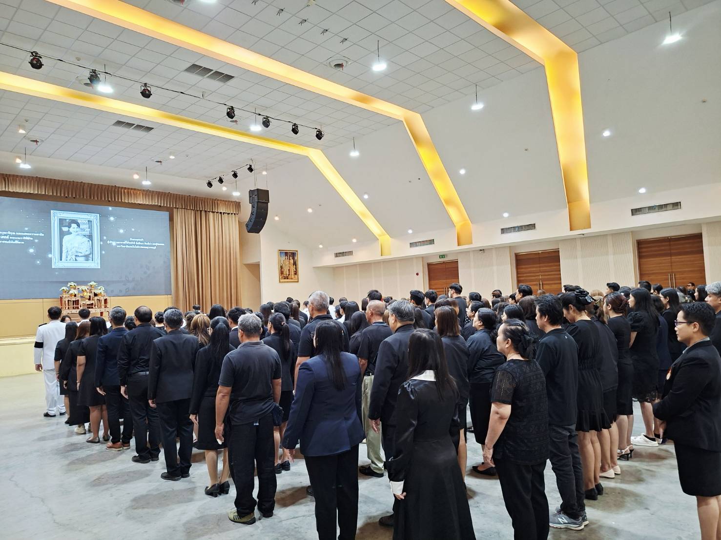 ยืนสงบนิ่ง น้อมสำนึกในพระมหากรุณาธิคุณอันหาที่สุดมิได้ที่พระองค์ทรงมีต่อพสกนิกรชาวไทย เป็นเวลา 93 วินาที ณ หอประชุมพระพิรุณ - ระลึกโปรดเกล้าฯ